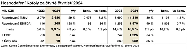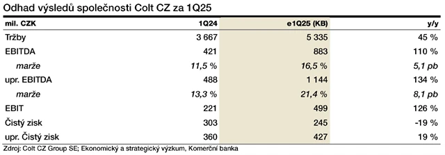 "Tržby Coltu za první kvartál podle nás vzrostly meziročně o výrazných 45,7 % na 5,34 miliardy Kč díky efektu akvizice výrobce munice Sellier & Bellot i díky náběhu nových vládních zakázek. Zisk EBITDA by se měl více než zdvojnásobit (+126 %) na 1,10 miliardy Kč díky růstu tržeb i faktu, že loňský výsledek byl zatížen mimořádnými marketingovými náklady. Management společnosti podle nás potvrdí výhled na celý rok (tržby 25 miliard Kč, EBITDA 5,5 miliardy Kč), a očekáváme proto celkově solidní vyznění zveřejněných dat," napsal Milan Vaníček.