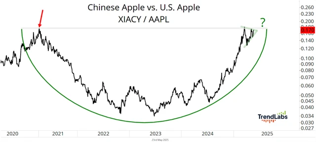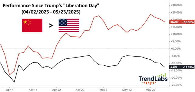 Od takzvaného dne osvobození (2. dubna), kdy trhy zareagovaly na změny v americko-čínských obchodních vztazích, do konce minulého týdne akcie Applu ztratily přes 12 %, zatímco akcie Xiaomi přidaly přes 18 %. To je rozdíl přes 30 procentních bodů. A že se od té doby na trzích nenudíme, linka Washington-Peking je hodně aktivní a cla doznala za tu dobu řady odkladů, výjimek a tarifních změn. Nadvýkonnost Xiaomi ale trvá.