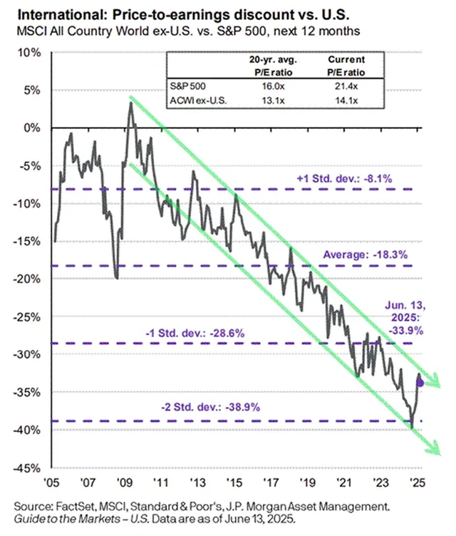 Akciový trh hledí do budoucnosti, ano. Aktuální diskont okolo 34 % ve prospěch světových akcií je nicméně oproti průměru za posledních dvacet let zhruba dvojnásobný. Americké akcie jsou tedy relativně extrémně drahé. I přes letošní zlepšení výkonnosti zůstávají trhy mimo USA strukturálně méně oblíbené, poslední vývoj ale může být náznakem obratu. Náznakem, ne důkazem.