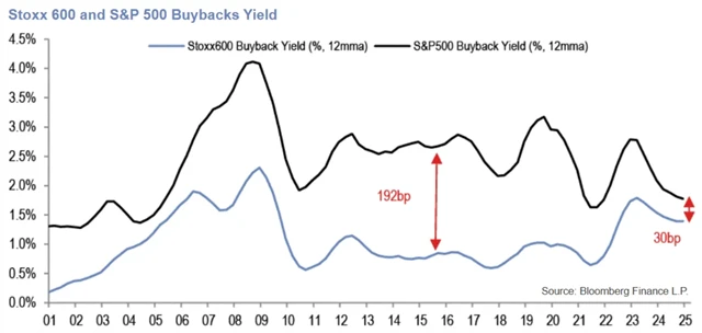 Důležitým ukazatelem je výnosnost akcií. Spojené státy byly dlouho silné v oblasti zpětných odkupů akcií, ale jejich náskok se zmenšuje. Od roku 2015 vzrostly odkupy amerických firem o 75 %, zatímco ty v Evropě se zvedly o 160 %. Aktuálně je výnos ze zpětných odkupů 1,8 % a v Evropě 1,4 %, a rozdíl je tak podstatně menší než dříve.