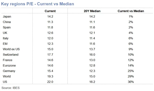 Americké akcie jsou ale nyní (a pravda, není to nic nového) podstatně dražší. Obchodují se za zhruba 22násobek zisků očekávaných v dalších 12 měsících, zatímco zahraniční trhy se obchodují při P/E okolo 15. Vyšší ocenění amerických firem bylo po léta obvykle ospravedlněno jejich lepšími hospodářskými výsledky, větším růstem, větší mírou inovací a tak dále.
