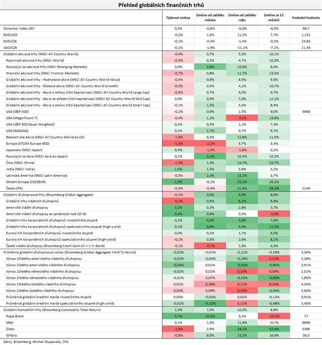 Za týden americký akciový index Dow posílil o 0,02 % a technologický Nasaq Composite přidal 0,21 %, zatímco S&P 500 oslabil o 0,15 %. Panevropský index STOXX Europe 600 klesl o 1,54 %, britský FTSE 100 se snížil o 0,86 %, německý DAX odevzdal 0,70 % a francouzský CAC 40 přišel o 1,24 %. "Dolar posílil o 0,5 %, globální akciový index MSCI All Country World ztratil 0,4 %, globální dluhopisový index Bloomberg Global Aggregate poklesl o 0,1 % a globální komoditní index Bloomberg Commodity Total Return se zvedl o 1,4 %," doplnil stratég Michal Stupavský ze společnosti Conseq Investment Management.