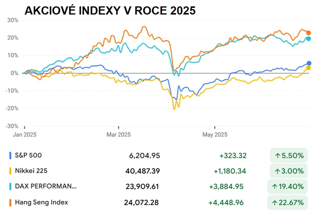 - Donald Trump nastoupil do úřadu amerického prezidenta a začalo zemětřesení v mezinárodním obchodě (zavádění vyšších cel a další jednání o nich) i politice (jistá náklonnost k Rusku, tlak na Ukrajinu a partnery v NATO, pokračující podpora Izraele, ale třeba i angažmá Elona Muska v dohledu nad efektivitou vlády, jež po jeho konci v této roli vedlo k nebývalé roztržce obou mužů). Pod tíhou obav z dopadů vysokých cel (zhoršení ekonomické výkonnosti při současném tlaku na růst cen) akciové trhy v USA prudce oslabily, od druhé dubnové dekády ale předvádějí mimořádně silný obrat a na konci června dokázaly stoupnout na nové historické rekordy.