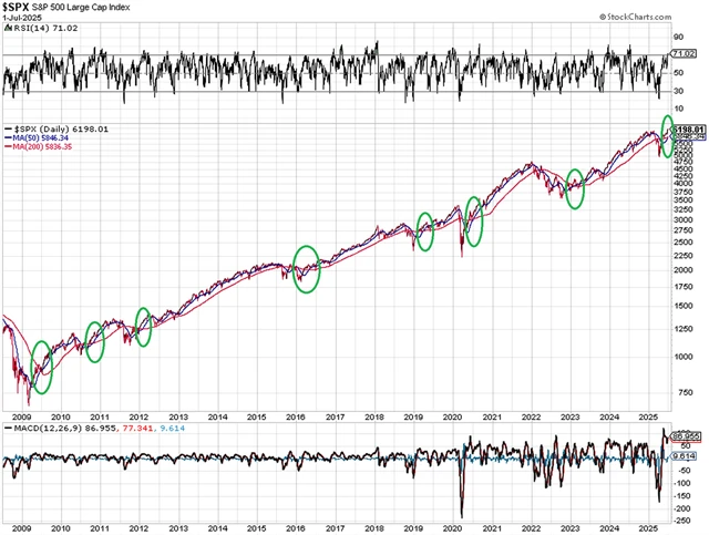 Na denním grafu amerického akciového indexu se 1. července objevil takzvaný zlatý kříž. Linie 50denního klouzavého průměru prorazila nad linii 200denního průměru. To bývá považováno za silný signál toho, že se trh po fázi slabosti přehoupl jednoznačně do nové růstové fáze. V době, kdy je index již na novém historickém maximu, je ale význam signálu minimálně oslabený.