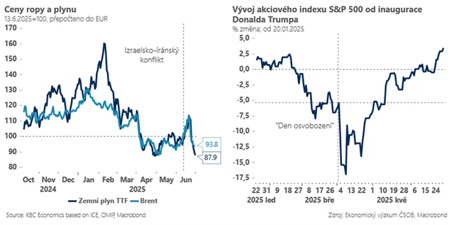 Růst od 9. dubna navíc není provázen lepšími ekonomickými fundamenty. Je důsledkem úlevy z toho, že se zatím nenaplňují některé nejhorší scénáře. Nejvyšší cla ze strany USA byla prozatím odložena a jedná se o obchodních dohodách, konflikt Izraele a Íránu skončil stejně překvapivě, jako začal, a s jeho koncem opět klesly ceny ropy a zemního plynu a po červnovém zasedání americké centrální banky lehce posílily sázky na pokles úrokových sazeb v letošním roce.