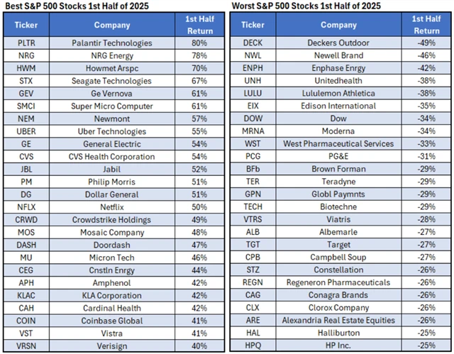 Nezbývá než se podívat na nejlepších a nejhorších 25 akcií z indexu S&P 500 za letošní první pololetí. White radí z těchto na základě důkladné vlastní analýzy (ani o prázdninách to na trzích bohužel nebude bez domácích úkolů, jestli jste se už snad radovali, že ano) vybrat konkrétní firmy, jejichž akcie mají potenciál do konce roku výrazně posilovat. Riziko je v jejich případě historicky vyšší, potenciál výnosu ale také.