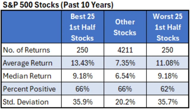 Je lepší investovat do akcií, které byly v první polovině roku nejúspěšnější, nebo naopak do těch, které výrazně ztratily (s očekáváním, že se odrazí ode dna)? Data za posledních deset let ukazují, že ty nejlepší i ty nejhorší akcie z prvního pololetí dosáhly v druhé polovině roku znatelně vyšších výnosů než zbytek indexu. Nejlepších 25 akcií v průměru do konce roku přidalo 13 %, nejhorších 25 titulů pak 11 %, zatímco zbytek indexu jen necelých 7,4 %. Obě krajní pětadvacítky nicméně vykazovaly vyšší volatilitu.