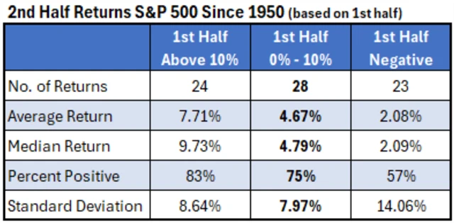 Ukazují přitom, že čím lépe si index S&P 500 vede v první polovině roku, tím větší má šanci na solidní výkonnost i ve druhém pololetí. Od roku 1950 index v druhé polovině roku průměrný výnos 4,67 % v případech, kdy byl za první půlrok v plusu mezi 2 % a 10 %. Ve třech čtvrtinách těchto případů zakončil druhé pololetí se ziskem. Řekněme, že po průměrných prvních pololetích nastával průměrný vývoj i ve druhém pololetí.