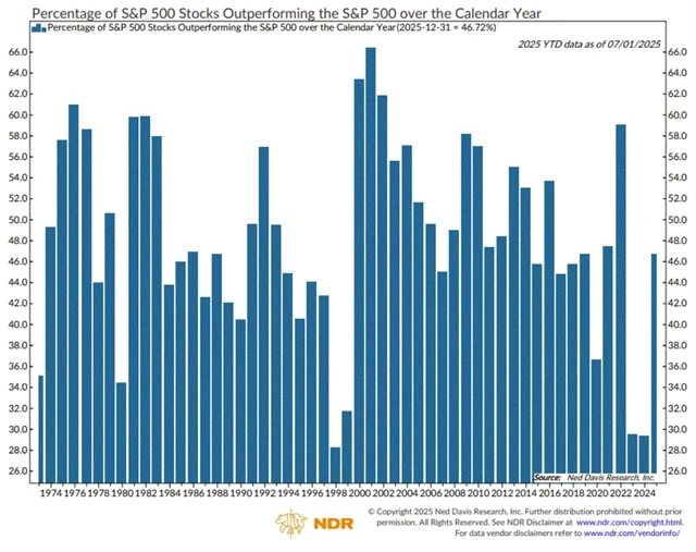 Oproti předchozím dvěma kalendářním rokům v prvním pololetí výrazně narostl podíl titulů, které svým výkonem překonávají samotný index S&P 500. To je v době vyšší nejistoty a volatility typické. Možnost najít vítěze je tedy otevřená.