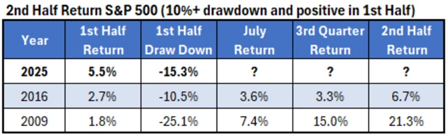 Vtip je samozřejmě v tom, jak neprůměrný byl průběh letošního prvního pololetí. S tím je potřeba počítat. Zajímavé je, že letos S&P 500 během první poloviny roku klesl o více než 10 %, než se vyšplhal zpět do plusu. V minulosti se něco podobného stalo pouze dvakrát, a to v letech 2009 a 2016. V obou případech následoval silný červenec (+3,6 %, +7,4 %), v druhých pololetích pak index přidal 6,7 % (2016), respektive více než 20 % (v opravdu výjimečném pokrizovém roce 2009).