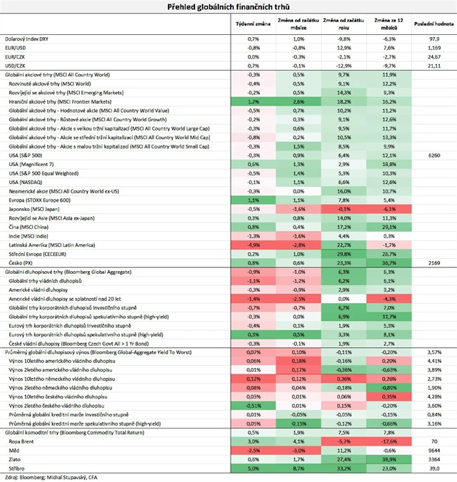 Celkově americké akciové indexy v týdnu klesly (Dow -1,02 %, S&P 500 -0,31 %, Nasdaq Composite -0,08 %) poté, co S&P 500 a Nasdaq zaznamenaly několik nových historických maxim. Západoevropské trhy naopak zpevnily (celoevropský STOXX Europe 600 +1,15 %, britský FTSE 100 +1,34 %, německý DAX +1,97 %, francouzský CAC 40 +1,73 %). "Americký dolarový index se zvedl o 0,7 % na 97,9 bodu, globální akciový index MSCI All Country World poklesl o 0,3 %, globální dluhopisový index Bloomberg Global Aggregate ztratil 0,9 % a globální komoditní index Bloomberg Commodity Total Return posílil o 0,5 %," doplnil stratég Michal Stupavský ze společnosti Conseq Investment Management.
