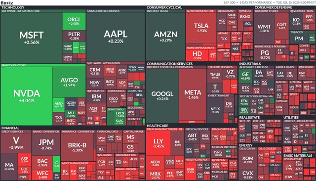 K vylepšení maxima indexu Nasdaq Composite nejvíce přispěly akcie Nvidie (+4,04 %), které se obchodovaly na novém rekordu (firma oznámila, že brzy obnoví dodávky svých čipů H20 do Číny). Společně s nimi posílily také cenné papíry Applu (+0,23 %), Alphabetu (+0,24 %) nebo Microsoftu (+0,56 %) a také banky Citigroup (+3,68 %). Naopak Tesla (-1,93 %), Meta Platforms (-1,46 %) a bank JPMorgan (-0,74 %) a Wells Fargo (-5,48 %) ztrácely společně s drtivou většinou titulů z indexu S&P 500 (posílilo jich celkem pouze 53).
