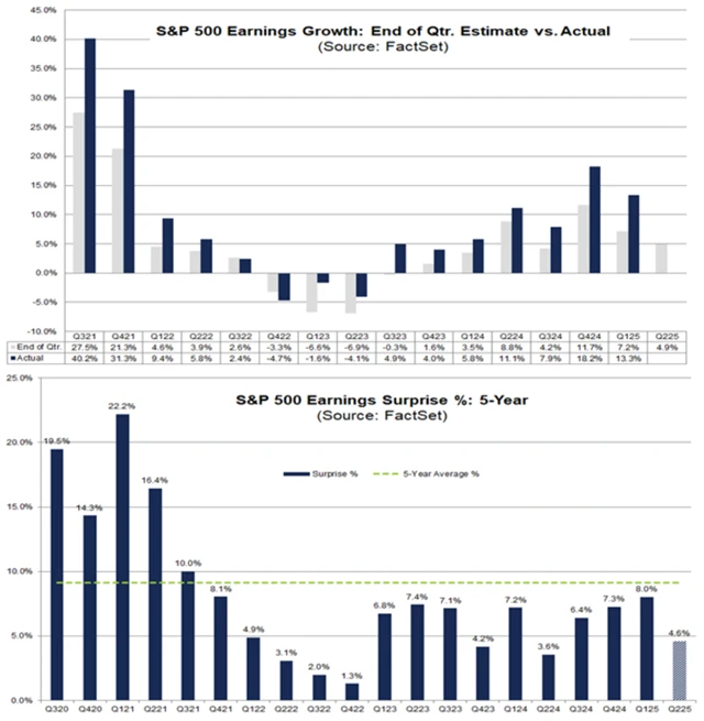 Analytici aktuálně čekají, že firmy z indexu S&P 500 za druhý kvartál vykáží meziroční růst zisků na akcii o 4,9 %. Výsledek ale může být podstatně lepší. Historická data ukazují, že většina firem z indexu pravidelně překonává očekávání, za posledních 10 let v průměru o 6,9 %, v posledních pěti letech pak dokonce o 9,1 %. Díky tomu se během výsledkové sezóny běžně zvyšuje celková míra růstu zisků oproti původním odhadům. Pokud by se průměrné zlepšení z posledních čtyř čtvrtletí (o 4,6 procentního bodu) zopakovalo, mohla by být výsledná meziroční růstová míra zisků za druhé čtvrtletí okolo 9,5 %.