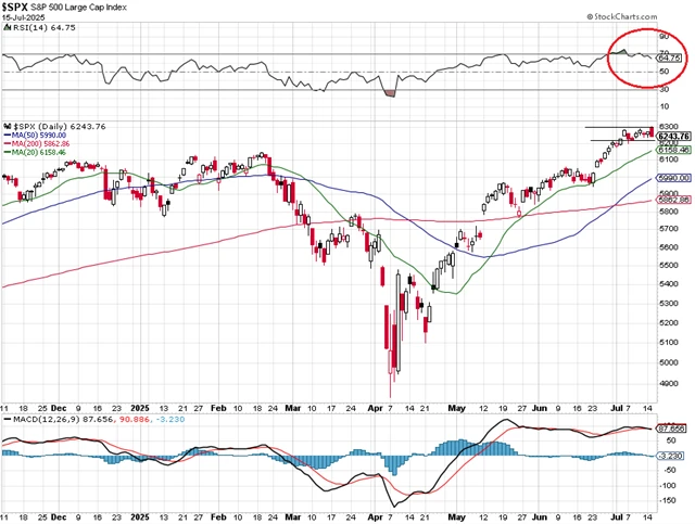 Index S&P 500 je přitom stále prakticky na historickém maximu a poměrně vysoko nad svými klouzavými průměry. Před pár dny byl v překoupeném pásmu (14denní index relativní síly nad 70), a tak není překvapivé, že při smíšených firemních výsledcích, nárůstu inflace a hlavně pokračující nejistotě hledně toho, jak to dopadne se cly v rámci obchodu USA s Evropskou unií a dalšími partnery, má trh tendenci předchozí růst konsolidovat.