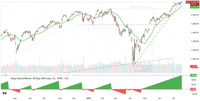 A už 59 obchodních dnů se drží nad svým 20denním klouzavým průměrem. Překonání rekordu z dubna 1998 (61 obchodních dnů) je na dohled a velice reálné.