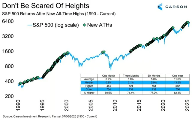 To se podle historických statistik nevyplácí ani při intuitivně lákavém omezení akciových pozic v době, kdy jsou hlavní indexy na vrcholu. V horizontu několika let jsou naopak investice přímo na historických maximech indexu S&P 500 lehce výnosnější než investice pod jeho vrcholem. A od roku 1990 byl index v ročním horizontu v plusu v 82,4 % případů s mediánovým posílením o 13,5 %.