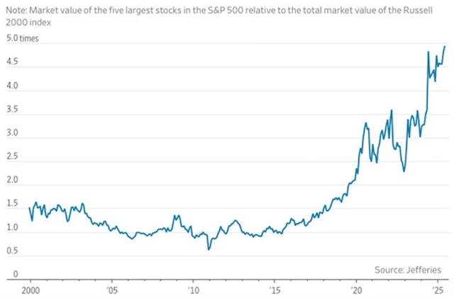Právě ve srovnání s indexem Russell 2000 jsou největší firmy z indexu S&P 500 co do velikosti na novém maximu. Tipovat, kdy na tomto grafu dojde k obratu, je extrémně ošidné. Ostatně jako každé jiné časování trhu.