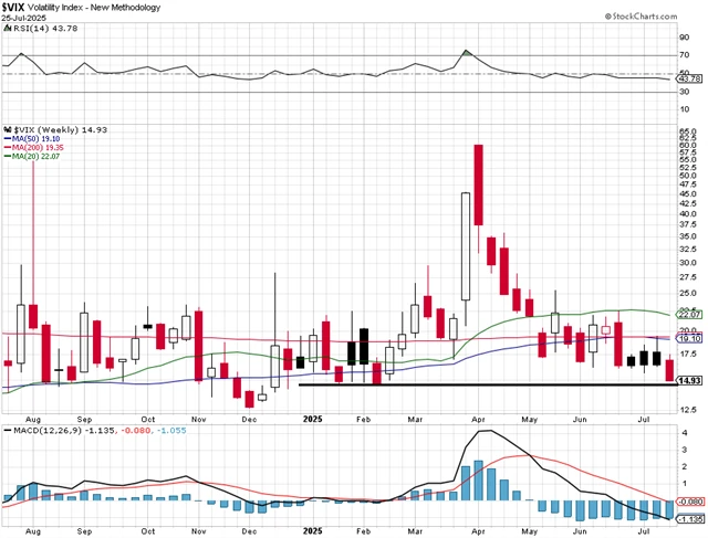 Index volatility VIX za týden klesl o 9,02 % a je na úrovni letošních minim. Poprvé od února uzavřel pod 15 a pro akcie je prozatím pozitivním signálem. Na takto nízké úrovni lze ale předpokládat brzký obrat výše, a tedy také alespoň mírnou korekci akciového indexu S&P 500.