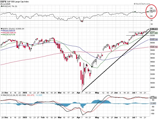 V červenci index S&P 500 celkově přidává 2,96 %, ačkoli za posledních 20 obchodních dnů hned 11krát uzavřel na novém rekordu. Překoupený trh se tak posouvá jen malými krůčky vzhůru, momentum vyprchává a je možné, že index alespoň mírně zkoriguje.