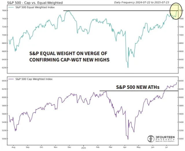 Dobrým znamením pro "kvalitu" současného býčího trendu je to, že v pátek index S&P 500, ve kterém je všem titulům přiřazena stejná váha, konečně také stoupl na nové maximum. To je důležité, protože dosavadní růst indexu S&P 500 byl poháněn některými velkými firmami. Čím širší je základna posilujících titulů, tím pro růstový trend lépe.
