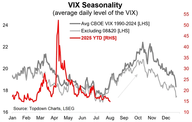 Horší historickou výkonnost akcií v USA ilustruje i sezónnost indexu volatility VIX. Ten minulý týden spadl prakticky na letošní minimum. Připomínám samozřejmě, že žádný rok není průměrný a ten letošní vůbec nemusí být v souladu s historickými trendy.