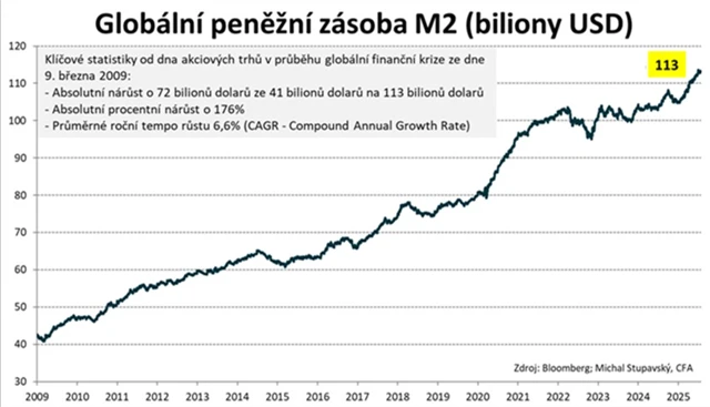 Domnívám se, že klíčovým důvodem posouvání rekordů na akciových trzích je strmý růst globální peněžní zásoby. Ta ode dna na akciových trzích v průběhu globální finanční krize v březnu 2009 vzrostla o 72 bilionů dolarů na aktuálních 113 bilionů dolarů. To odpovídá průměrnému ročnímu tempu růstu (CAGR) 6,6 %. Od začátku letošního roku vzrostla globální peněžní zásoba o 8 bilionů dolarů (7,6 % v relativním vyjádření). Tomuto vývoji samozřejmě hodně pomohlo prudké oslabení amerického dolaru, ten podle dolarového indexu spadl o zhruba 10 %.