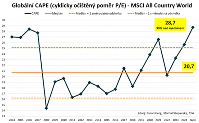 S novými rekordy na akciových trzích vystoupaly na nová maxima ovšem také globální akciové valuace. Globální CAPE neboli cyklicky očištěný poměr P/E indexu MSCI All Country World dosahuje 28,7. Tato hodnota je 39 % nad dlouhodobým mediánem (20,7). Jde o nejvyšší hodnotu na časové ose od roku 2004. Předchozího maxima (28,4) bylo dosaženo již v roce 2006.