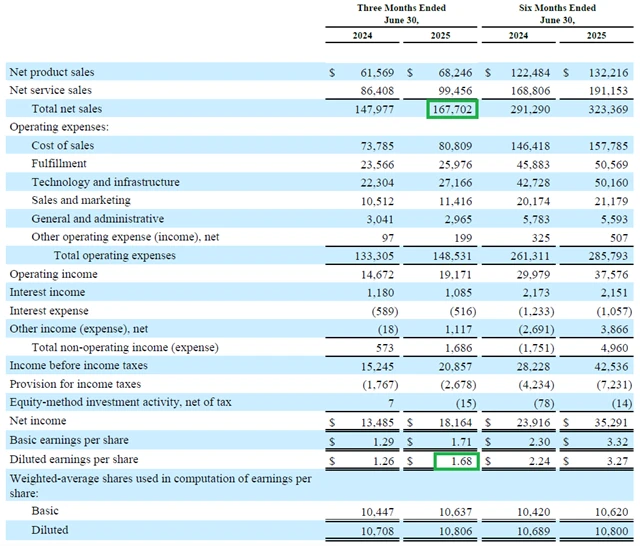 Amazon za letošní druhé čtvrtletí vykázal zisk 1,68 dolaru na akcii, čekalo se jen 1,33 dolaru. Tržby jedné z největších amerických firem vzrostly meziročně o zhruba 13 % na 167,7 miliardy dolarů, analytici vyhlíželi pouze 162,09 miliardy.