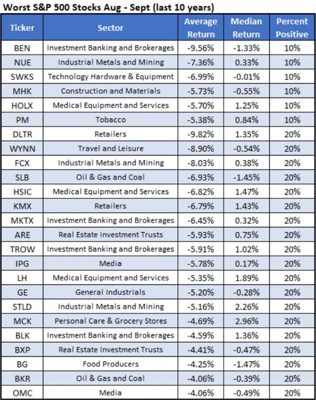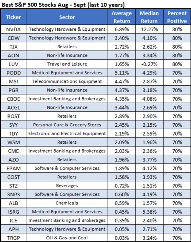 Pro investory, kteří by si chtěli další týdny z(ne)příjemnit konkrétními akciovými sázkami, mohou samozřejmě zalovit mezi tisíci akcií na globálních trzích. Když je ale řeč o indexu S&P 500, můžou jako inspirace posloužit nejvýkonnější tituly za srpen a září za posledních deset let. Jde o akcie, které v uplynulé dekádě dokázaly nejlépe odolávat popsanému sezónnímu protivětru.