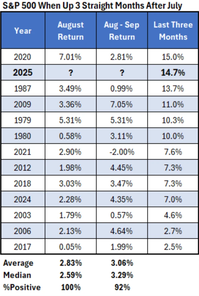 Investoři, kteří nyní hledají světlé body na tržní mapě, nepochybně narazí na rostoucí zisky a silné marže amerických firem. A v historických datech mohou naděje na další býčí vývoj vzbuzovat statistiky vývoje indexu S&P 500 právě po třech růstových měsících od května do července. Od roku 1975 se to stalo 12krát a srpen dopadl pak vždy pozitivně (v průměru +2,83 %). Kombinace srpna a září pak byla plusová v 11 z 12 případů.
