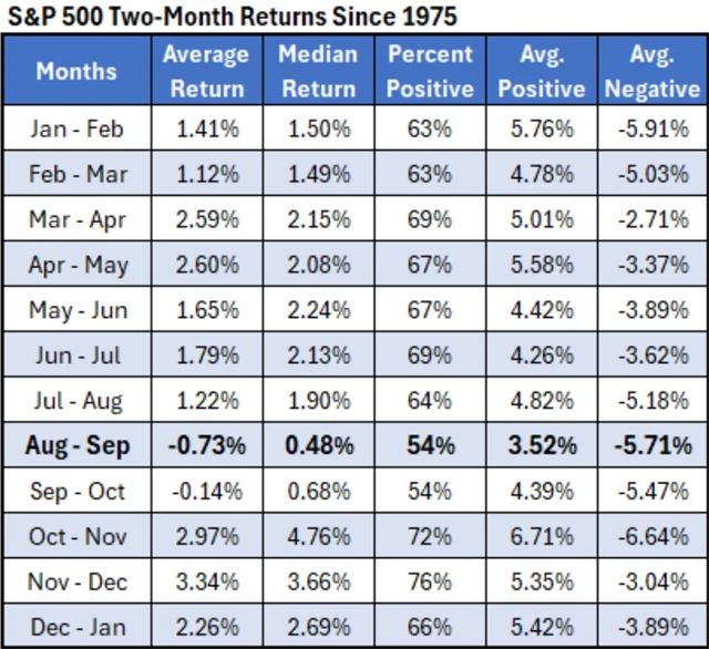 Od začátku května do konce července S&P 500 přidal 13,83 % a posílil v každém ze tří měsíců. Pokud by investoři chtěli být nervózní, najdou v současnosti řadu pádných důvodů (cla, inflace, nejistota ohledně vývoje sazeb a ekonomiky, geopolitika, vysoké valuace). A vedle toho začíná také historicky nejslabší období pro americký akciový trh v rámci celého roku.