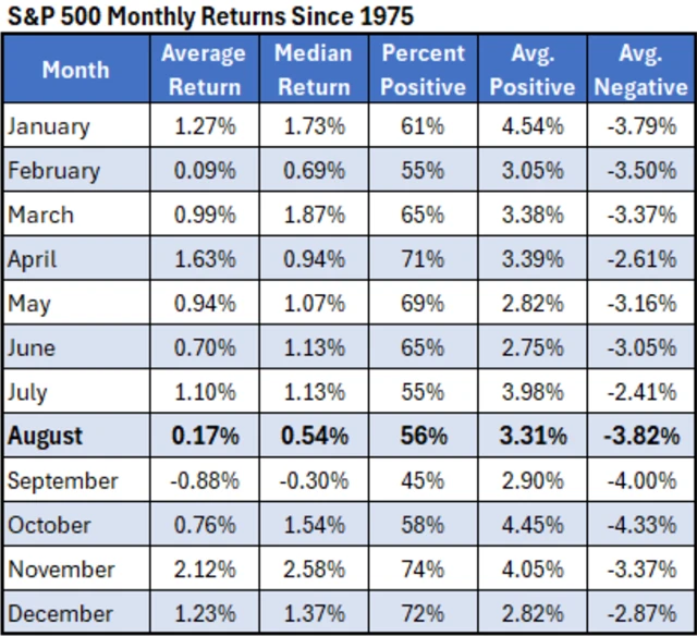 Od roku 1975 S&P 500 v srpnu v průměru přidal jen 0,17 % a vzrostl jen v 56 % let. Podle průměru a mediánu jde o třetí, respektive druhý nejhorší měsíc roku.