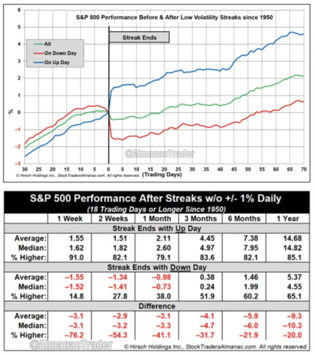 Index S&P 500 v pátek 1. srpna výraznou ztrátou (-1,60 %) zakončil dvě pozitivní série. Po 26 obchodních dnech se poprvé posunul o více než procento. To, jak podobně dlouhá období nízké volatility skončí, přitom historicky poměrně spolehlivě naznačuje další krátkodobý vývoj. Od roku 1950 bylo zaznamenáno 175 sérií, kdy S&P 500 nejméně 18 po sobě jdoucích dnů neuzavřel s větší změnou než 1 %. Ve většině případů (62 %) takové série skončily poklesem. Když série vyústila v denní růst o 1 % a více, následující týden byl v 91 % případů růstový (v průměru o 1,6 %). Když ale série skončila poklesem o procento a více, index v průměru po dobu 1–4 týdnů podával podprůměrné výkony. Páteční pokles tak z historického hlediska znamená spíše slabší krátkodobý výhled.
