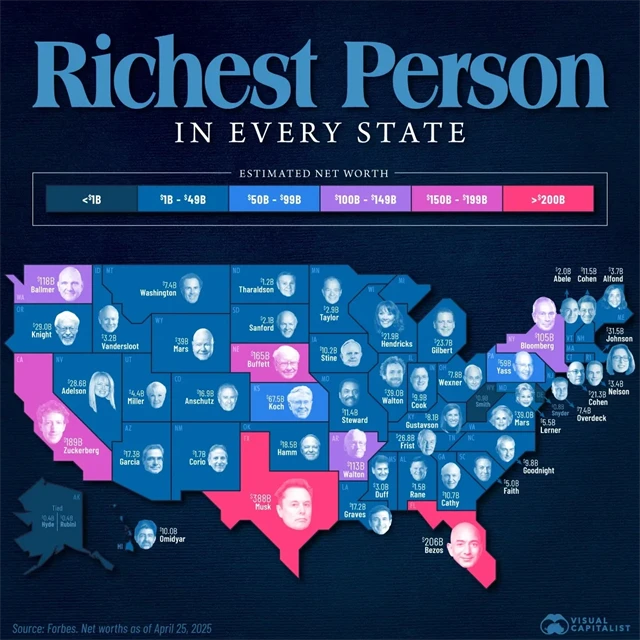 Od technologických magnátů po maloobchodní krále - nejbohatší osoby v každém americkém státě zastupují odvětví, která jsou jádrem bohatství napříč celou zemí. Následující mapa ukazuje nejbohatšího člověka v každém americkém státě a jeho odhadované čisté jmění, jak je uváděl magazín Forbes k 25. dubnu.
