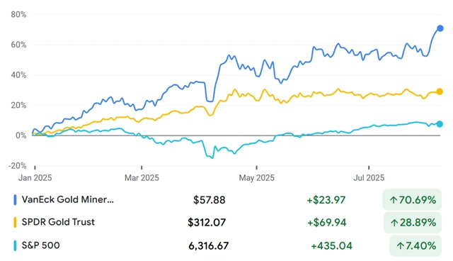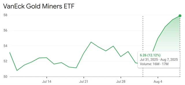 Akcie těžařů zlata, které sleduje ETF s tickerem GDX, jen od začátku srpna zdražily jako celek o zhruba 12 %.