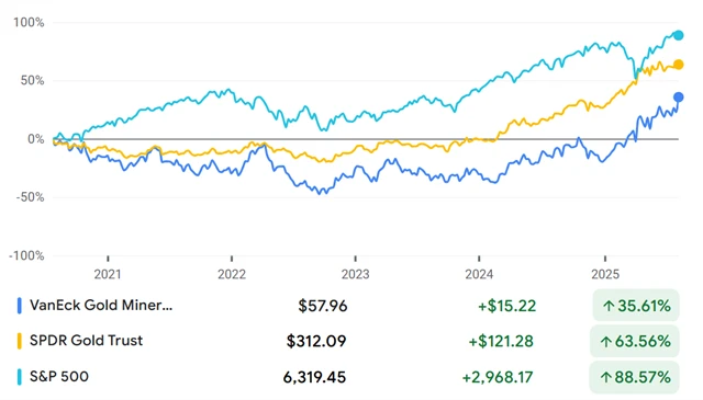 V minulých letech to ale bylo jinak. Zatímco index S&P 500 za pět let roste o bezmála 90 % a cena zlata je o zhruba dvě třetiny vyšší, cenné papíry producentů kovu jsou výše jen o 35 %. A to je ještě jen díky letošnímu růstu.