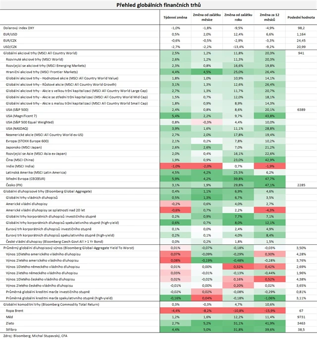 Americké akciové indexy v týdnu vzrostly, Nasdaq dokonce na nové maximum (Dow +1,35 %, S&P 500 +2,43 %, Nasdaq Composite +3,87 %). Západoevropské trhy také rostly (STOXX Europe 600 +2,11 %, britský FTSE 100 +0,30 %, německý DAX +3,15 %, francouzský CAC 40 +2,61 %). "Dolarový index klesl o procento na 98,2 bodu, globální akciový index MSCI All Country World stoupl o 2,5 %, globální dluhopisový index Bloomberg Global Aggregate přidal 0,4 % a globální komoditní index Bloomberg Commodty Total Return se zvedl o 0,3 %," doplnil stratég Michal Stupavský ze společnosti Conseq Investment Management.