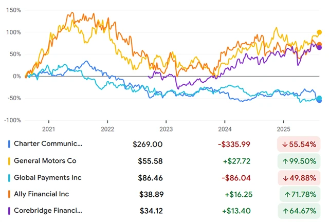 V rámci svého portfolia aktuálně má vsazeno na akcie společností Charter Communications, General Motors, Global Payments, Ally Financial a Corebridge Financial. Všechny tyto firmy se obchodují při ani ne třetinovém P/E ve srovnání s S&P 500. "Přitom mají stabilní výnosy z volného cash flow, které nepotřebují reinvestovat. Mohou tak financovat programy zpětných odkupů akcií a vyplat dividend, což následně podporuje jejich zisky na (volně obchodovanou) akcii na úroveň, která je naprosto konkurenceschopná v prostředí třikrát dražších společností," popisuje Nygren s tím, že dobrým příkladem je třeba automobilka General Motors.