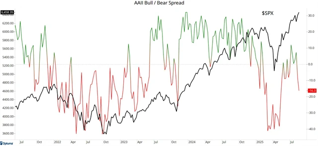 Ve středu 13. srpna uzavřely americké indexy S&P 500 i Nasdaq Composite na nových historických maximech, první jmenovaný pak ještě rekord kosmeticky vylepšil. Ačkoli by se mohlo zdát, že optimismus na trhu bude také na vrcholu, je to jinak. Číst to lze jako pozitivní zprávu pro býky, je ale namístě i varování.