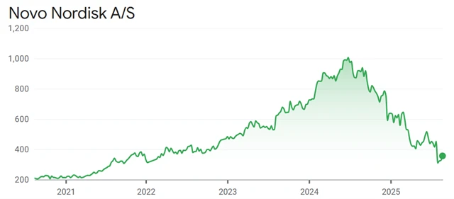 Velká dánská farmaceutická společnost je známá hlavně díky lékům na hubnutí Ozempic a Wegovy. Na maxima z poloviny loňského roku akcie firmy ztrácejí přes 60 %, který výrazněji nezvrátily ani poslední oznámené hospodářské výsledky. Firma vykázala výrazný růst, ale zaostala za ještě optimističtějšími odhady, a navíc snížila svůj celoroční výhled.