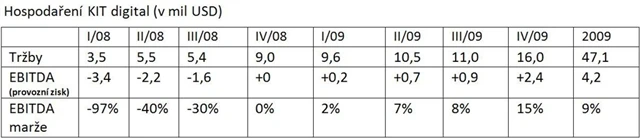 KIT Digital definuje ukazatel EBITDA jako výsledek hospodaření bez započtení zisků/ztrát z nepeněžních operací (warranty), nepeněžních odměn ve formě akcií, jednorázových nákladů spojených s akvizicemi a ostatních jednorázových nákladů. Právě tyto položky zatím nechávají KITD v účetní ztrátě. Výsledek těchto položek činil 6,1 mil dolarů za prvních 9 měsíců 2009.
