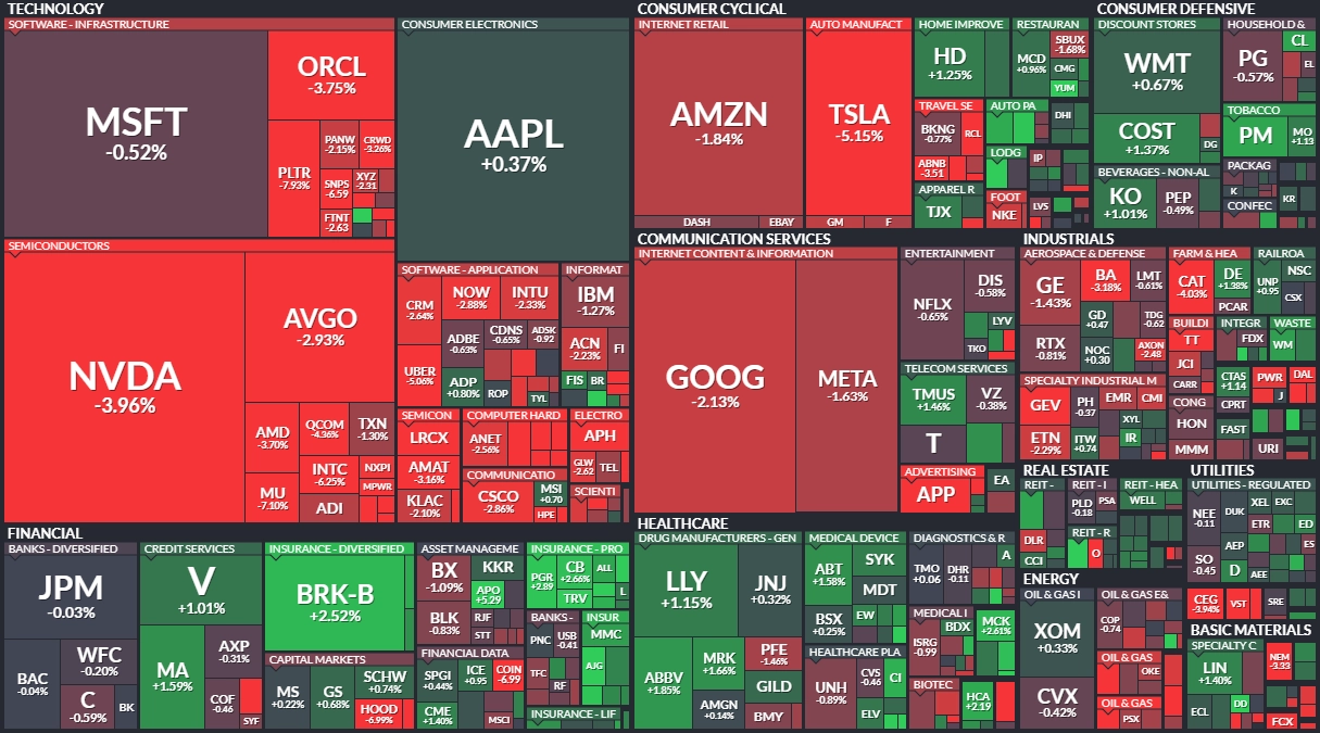 Index Dow klesl o 0,53 % na 47 085,24 bodu, širší S&P 500 se snížil o 1,17 % na 6 771,55 bodu a index technologického trhu Nasdaq Composite uzavřel se ztrátou 2,04 % na 23 348,64 bodu. Index volatility VIX vyskočil o 10,66 % na 19 bodů a výnos 10letých vládních dluhopisů USA se snížil o dva a půl bazického bodu na 4,083 %. Cena bitcoinu večer klesala o více než 4 % na 101 250 dolarů a během dne poprvé od června sestoupila pod 100 tisíc dolarů.