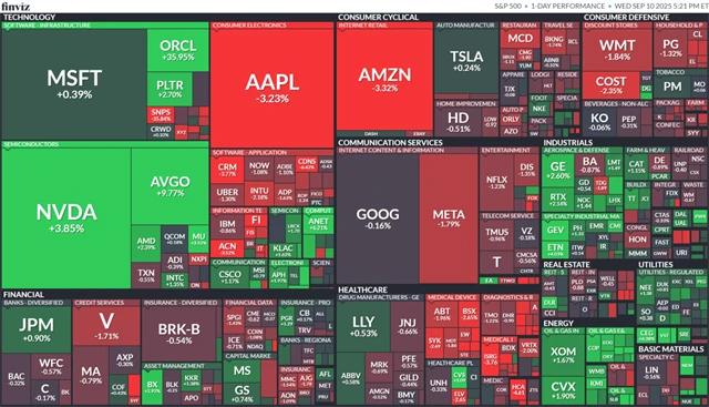 Výrazně se dařilo akciím společnosti Oracle (+35,95 %), které mají za sebou nejlepší den od roku 1992. Firma oznámila za kvartál růst tržeb z multicloud databází od Amazonu, Googlu a Microsoftu o 1 529 % díky vysoké poptávce po serverech pro umělou inteligenci. Firma navíc očekává, že do fiskálního roku 2030 dosáhne tržeb z cloudové infrastruktury na úrovni 144 miliard dolarů oproti 10,3 miliardy v roce 2025. Rally akcií firmy udělala z Larryho Ellisona, spoluzakladatele a předsedy správní rady firmy, nejbohatšího člověka na světě.