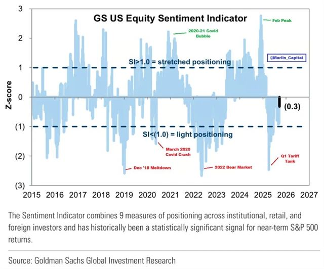 A v neposlední řadě je tu indikátor celkových pozic na americkém akciovém trhu od Goldman Sachs. Ten sleduje, jak velký podíl akcií z USA mají v portfoliích různé typy investorů. V současnosti přitom odhaluje, že oproti benchmarkům jsou investoři na trhu v Americe nadále mírně podvážení. "To není úroveň pozic, kterou bychom viděli na vrcholu případné spekulativní bubliny nebo nebo obecně býčího trendu. Velký objem kapitálu ještě stále 'váhá', zda se pustit do akciové hry. Potenciál růstu index S&P 500 tedy stále není vyčerpaný," dodávají analytici z americké investiční banky.