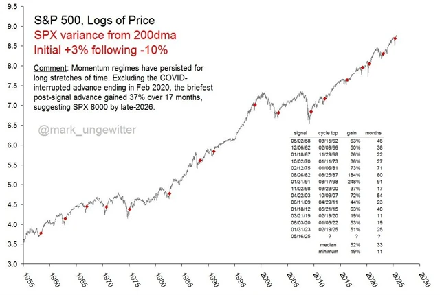 "Jak dlouho může trvat růstové momentum? Většinou déle, než si lidé myslí. Index S&P 500 určitě ze současných úrovní může klesnout, sesun o 5–10 % by neměl nikoho překvapit. Obdobné 'momentové režimy', jako je ten, který probíhá v současnosti, ale naznačují, že index může pokračovat v býčím trendu minimálně další rok. Vrchol přitom může být až okolo 8 000 bodů," říká nezávislý analytik a komentátor Mark Ungewitter.
