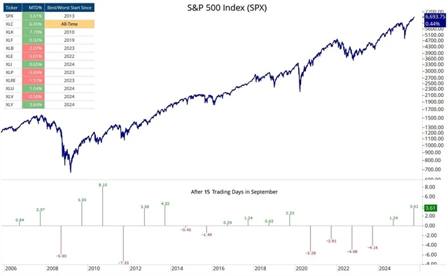 Index S&P 500 v září zatím přidává 3,61 %. První podzimní měsíc je přitom pro akciový trh v USA historicky ten vůbec nejslabší a probíhající týden (39. obchodní týden roku) byl v minulosti pro index jeden z nejméně příznivých za celý rok. V pondělí začal dalším rekordem. Sezónnost zkrátka letos nefunguje, třeba i vousaté "Sell in May and Go Away" bylo letos dokonale kontrariánským příslovím, když v květnu, červnu, červenci i srpnu akciový trh vzrostl. Teď má zaděláno na pátý růstový měsíc v řadě.