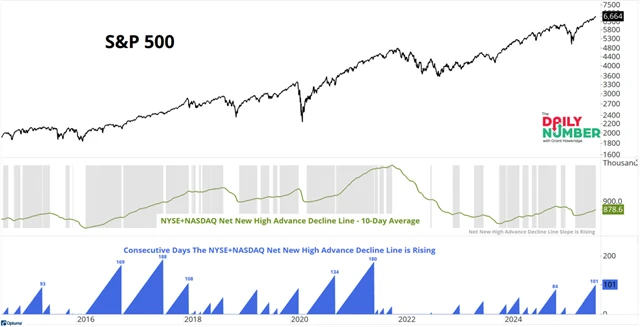 Dokonce už 102 obchodních dnů (graf je z pondělí během dne) trvá růst indikátoru Advance-Decline line (A/D line). Ten měří, kolik akcií na burze posiluje oproti těm, které oslabují. V případě níže uvedeného grafu jde konkrétně o Net New High A/D line pro burzy NYSE a NASDAQ, tedy rozdíl mezi počty akcií, které dosáhly nových maxim, a těch, které spadly na nová 52týdenní minima. Sleduje v praxi to, zda růst (či pokles) hlavních indexů táhne třeba jen několik velkých titulů, nebo se do něj zapojuje většina akcií. Aktuální série signalizuje, že růst na americkém akciovém trhu je stabilní a široce založený. Tak dlouhé série obecně nevznikají na slabém, pár tituly taženém trhu. "Nová maxima stabilně převažují nad novými minimy, a to už déle než čtyři měsíce. Takhle nevypadá euforie, tohle je stabilní vzestup," říká Grant Hawkridge z All Star Charts.