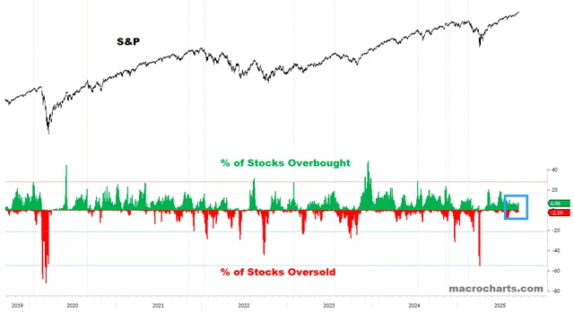 Krátkodobě je index S&P 500 překoupený, 14denní index relativní sily (RSI) je nad 74 body. Na úrovni jednotlivých titulů ale překoupenost není nijak nadprůměrná, týká se zhruba 7 % titulů z indexu. To je podstatně méně než při jinýh vrcholech indexu v minulosti.