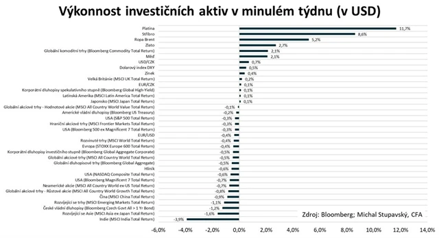 "Nejlepší a nejhorší výkonnost v amerických dolarech měly v týdnu platina (+11,7 %), stříbro (+8,6 %) a ropa Brent (+5,2 %), nejhorší naopak indické akcie (MSCI India Total Return -3,9 %), akcie v rozvíjející se Asii (MSCI Asia ex-Japan Total Return -1,6 %) a české vládní dluhopisy (Bloomberg Czech Govt All > 1 Yr Bond -1,2 %). Na dluhopisovém trhu se nedařilo právě korunové duraci, výnosy českých vládních dluhopisů s delšími splatnostmi poměrně výrazně vzrostly, desetiletá splatnost o 14 bazických bodů na 4,58 % a patnáctiletá splatnost o 9 bazických bodů na 4,79 %," doplnil stratég Michal Stupavský ze společnosti Conseq Investment Management.