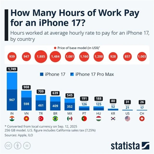 Na nový iPhone musí průměrný Američan v průměrné práci vydělávat 21 hodin. To Indovi to bude trvat 967 hodin a třeba i Maďarovi to potrvá šestkrát déle než Američanovi. Čech v grafu není, ale při ceně základního modelu kolem 23 tisíc korun a při průměrné mzdě asi 48 tisíc korun mu to vychází na zhruba dva pracovní týdny, takže asi 85 hodin.